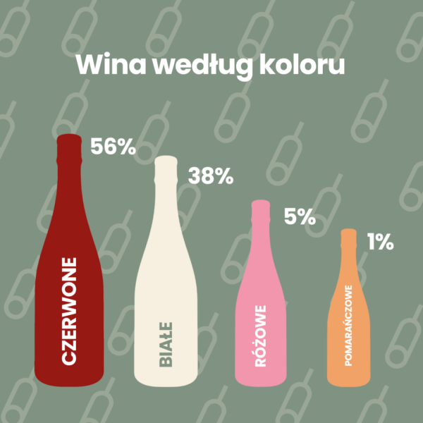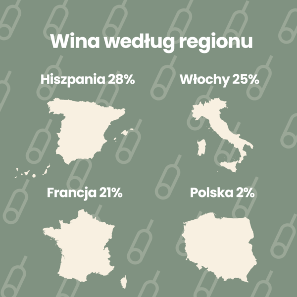 W tym roku zdecydowanie śmielej wybieraliście wina czerwone, bo te zamówienia stanowiły aż 56%. Białe wina stanowiły 38% zamawianych przez Was win. Wino różowe nieprzerwanie walczy o uwagę, wszak niespełna 5% różowych win znalazło się w Waszym koszyku. A wina pomarańczowe? Tu jeszcze wiele mamy do zrobienia :) Rynek win pomarańczowych dynamicznie się rozwija. Wierzymy więc, że w roku 2025 uda nam się Was przekonać do nowych smaków 🙂