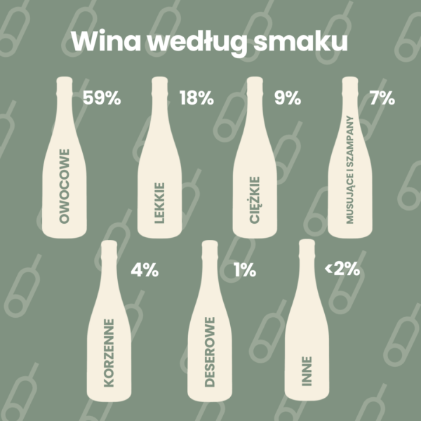 Zdecydowanie lubujecie się w winach o nutach bardziej owocowych, bo aż 59% win w Waszych koszykach to właśnie te wyraźnie owocowe. Chętnie wybieracie wina lekkie, a tylko niektórzy decydują się na wina ciężkie, z potężnym kalibrem. Szampany i wina musujące to już taki klasyk, ale nie ukrywamy, zaskakujące, że zaledwie 7% z Was się na nie decyduje. W słodkich winach wciąż mamy wiele do zrobienia. Zapewniamy Was, że do świątecznego makowca i serniczków nie ma nic lepszego niż wino deserowe.