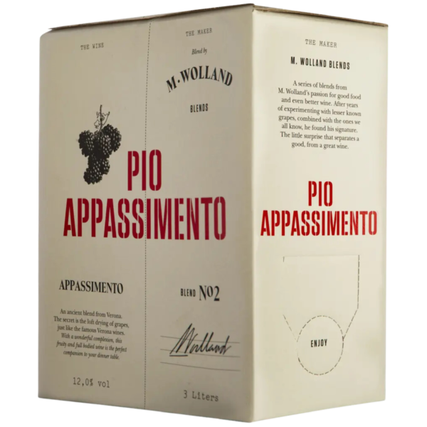 Włoska czerwień z regionu Veneto oparta o szczep merlot. Połowa gron była suszona na krzakach, co zapewnia winu odpowiednią koncentrację i słodkie aromaty. Wino ma intensywny rubinowy kolor. W nosie przeważają aromaty czerwonych owoców wzbogacone o nuty kakao i cynamonu. Usta gładkie, pełne i soczyste. Przyjemna kwasowość, dość lekki charakter czynią go idealnym winem na piknik bądź imprezę przyjaciółmi
