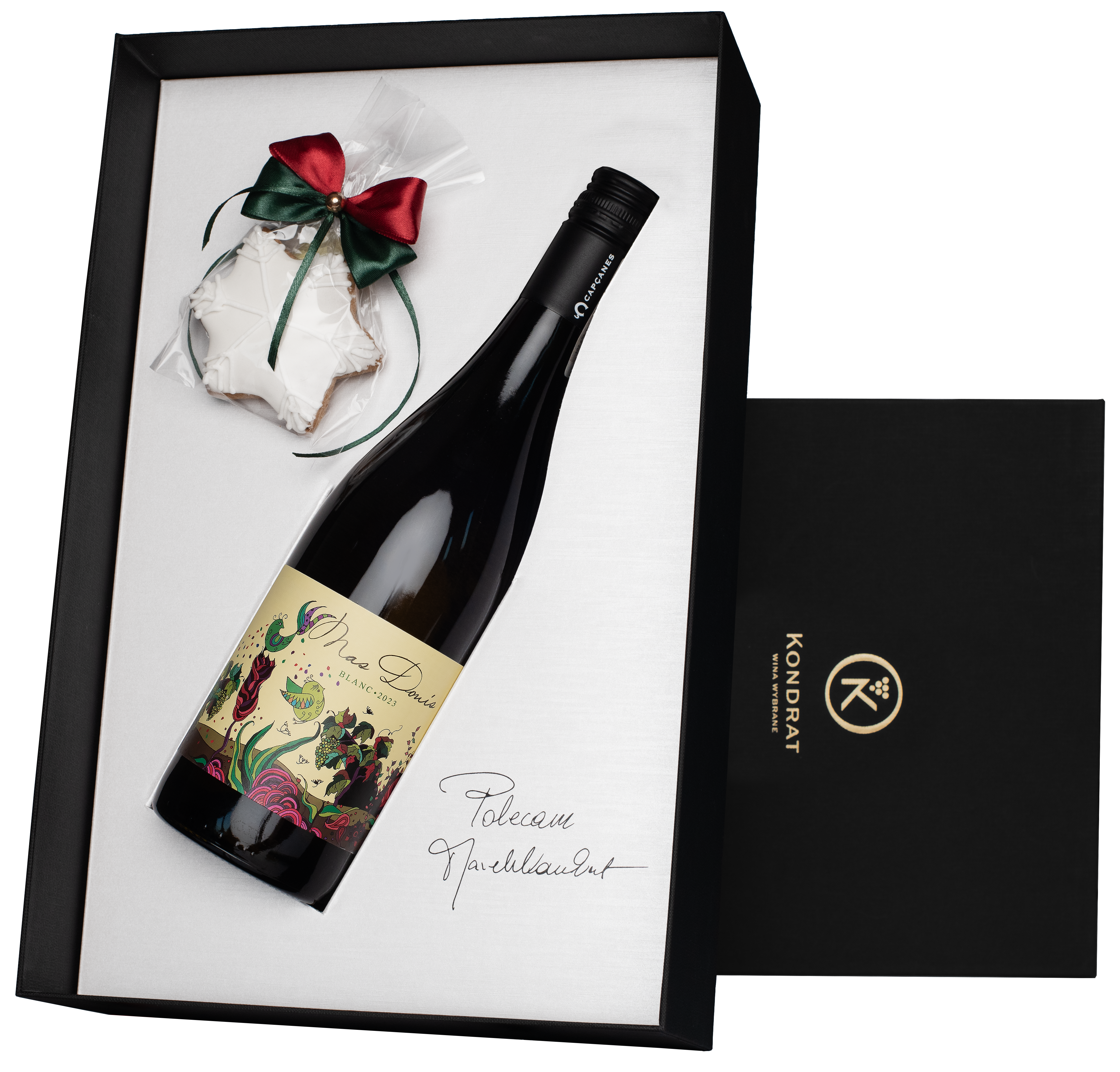 Białe wino Capcanes Mas Donis Blanc Montsant DO z Hiszpanii w eleganckim pudełku kartonowym w kolorze czarnym z owijką ze świątecznym wzorem i z tekstem „Wytrawnych Świąt i szczęśliwego Nowego Roku!”. W środku opakowania znajduje się faksymile „Polecam, Marek Kondrat” oraz ręcznie wykonany piernik dekorowany z akcentem świątecznym.
