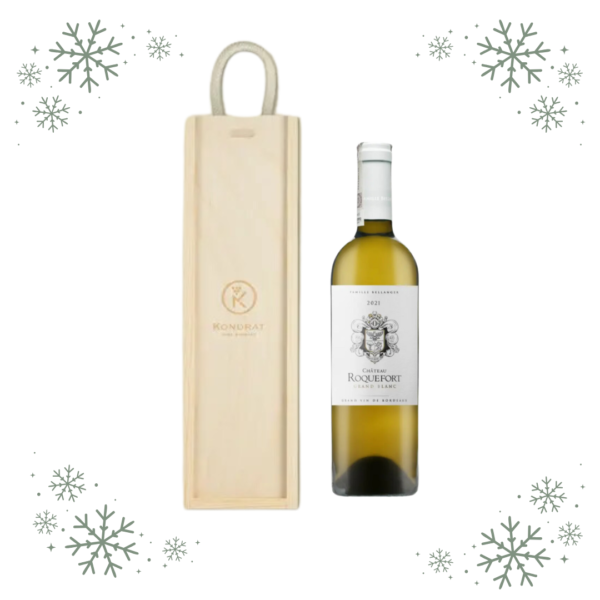 Château Roquefort Roquefortissime w skrzynce na Święta w drewnianej skrzynce z wygrawerowanym logo firmy Kondrat Wina Wybrane.