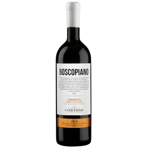 Boscopiano to najwyższe wino organicznego producenta Cortese. Podstawę stanowi szczep frappato, który świetnie sprawdza się w południowo wschodniej części Sycylii. Do produkcji wina posłużyły tylko najlepsze grona, zbierane do małych dziesięciokilogramowych skrzynek dopiero na początku października. Boscopiano to uhonorowanie tradycji i rzemiosła. Suknia rubinowa z fioletowymi refleksami. W nosie typowe dla szczepu nuty czerwonych owoców z przyprawowym sznytem. Po chwili do głosu dochodzą nuty pomarańczy i prażonych migdałów. W ustach bardzo złożone, niezwykle finezyjne z bardzo długim finiszem. Zintegrowana kwasowość i aksamitna tanina dopełniają całość. Produkcja limitowana obejmuje tylko kilkaset butelek. Świetnie sprawdzi się do wysublimowanych dań, dziczyzny czy dzikiego ptactwa.