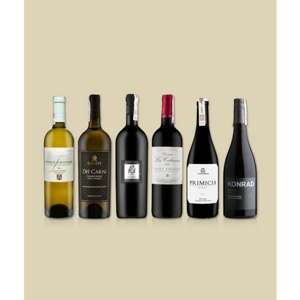 Na zestaw składają się dwie białe pozycje: bogate włoskie chardonnay od producenta Giusti i beczkowane sauvignon blanc z Bordeaux. Czerwone tytuły to aromatyczne nowozelandzkie pinot noir, solidna Rioja w wersji crianza, włoskie primitivo z najwyższej półki ze słodkim akcentem oraz zaskakujący doskonałą jakością w stosunku do ceny francuski kupaż merlot z cabernet franc z Saint-Émilion. Kompozycja została przygotowana w taki sposób, aby ucieszyć i zaskoczyć osoby znające się na winie i takie, które poszukują win z klasą. Świetny prezent dla koneserów i początkujących. Zestaw dostępny jest również w skrzynce drewnianej.