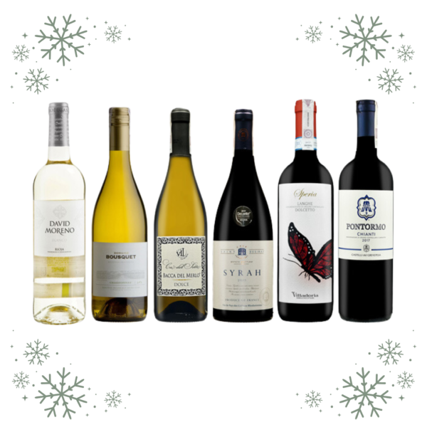 W zestawie jest sześć różnych win, które znakomicie sprawdzą się w okresie świątecznym. Bousquet Chardonnay i David Moreno Blanco Joven Rioja polecamy do potraw z rybą i sałatek warzywnych. Wina czerwone: Villadoria Dolcetto, Grevepesa Pontormo Chianti i Cave Saint-Desirat Syrah Collines będą pasować do pierogów i innych dań z grzybami. Półsłodkie Ca’ del Sette Bacca del Merlo może towarzyszyć ciastom. Każdy ze świątecznych gości znajdzie tu coś dla siebie.