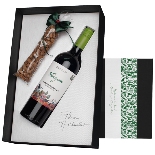 Zestaw świąteczny z wyjątkowym winem Bousquet Virgen Red z Argentyny zapakowany w eleganckim pudełku kartonowym w kolorze czarnym z owijką ze świątecznym wzorem i z tekstem „Wytrawnych Świąt i szczęśliwego Nowego Roku!”. W środku opakowania znajduje się faksymile „Polecam, Marek Kondrat” oraz zestaw orzeszków ziemnych w glazurze z akcentem świątecznym.