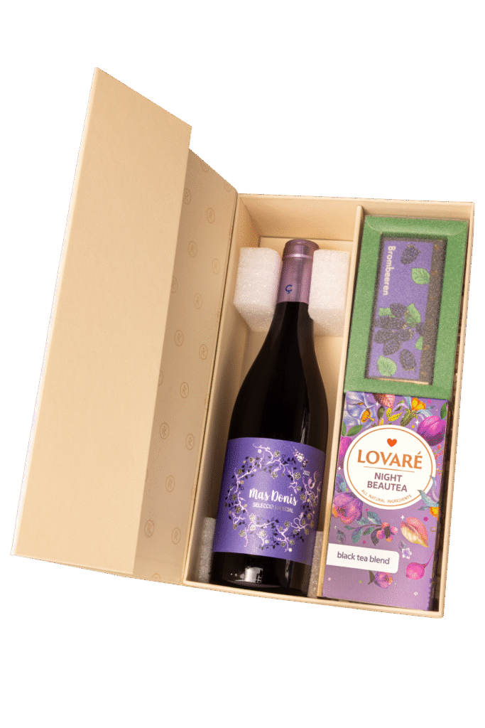 W przepięknym beżowym opakowaniu otwierającym się jak skrzyneczka znajduje się wino Capcanes Mas Donis Old Vines Montsant DO 2022 oraz słodkie dodatki takie jak: czekolada nadziewana Blackberries od producenta Zotter oraz herbata czarna Lovare Night Beautea. Wyjątkowy charakter prezentu podkreśla świąteczna owijka z logiem Kondrat Wina Wybrane.