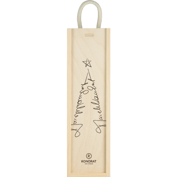 Skrzynka na jedną butelkę wykonana z drewna sosnowego oraz sklejki brzozowej. Na zasuwanej ściance widoczne jest logo firmy Kondrat Wina Wybrane oraz świątecznym akcentem w postaci choinki. Skrzynka posiada solidny uchwyt wykonany ze sznurka.