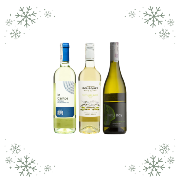 Zestaw Święta całe na biało tworzą trzy wytrwane, białe wina. Przystępne i ekspresyjne nowozelandzkie sauvignon blanc, ekologiczny przedstawiciel tego samego szczepu z Argentyny, oraz In Cantos z maleńkiej apelacji liczącej zaledwie 150 ha winnic zlokalizowanych w okolicach miasta Cagliari.