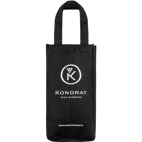 Czarna torba z logo Kondrat Wina Wybrane wykonana z wytrzymałego materiału syntetycznego. Wszyte przegrody zapewniają bezpieczny transport czterem butelkom wina.