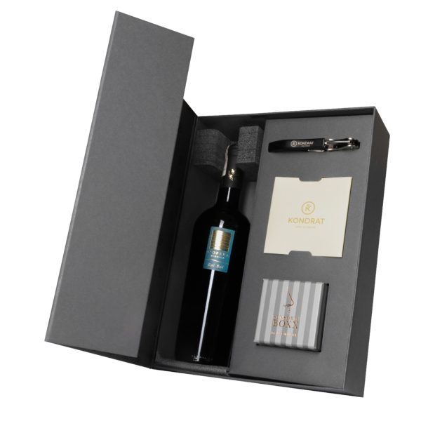 Zestaw edukacyjny w eleganckim, czarnym opakowaniu zamykanym na magnes. Wewnątrz skrywa cztery produkty: wino L’Opera Sol Sol, trybuszon kelnerski z logo Kondrat Wina Wybrane, fiolki z aromatami występującymi w szczepie solaris (ananas, gruszka, czarny bez) oraz broszurę z informacjami o tej odmianie. Zestaw został skomponowany w taki sposób, aby każdy, nawet początkujący miłośnik wina, mógł rozwijać swoje umiejętności w rozpoznawaniu zapachów i aromatów ukrytych w kieliszku.