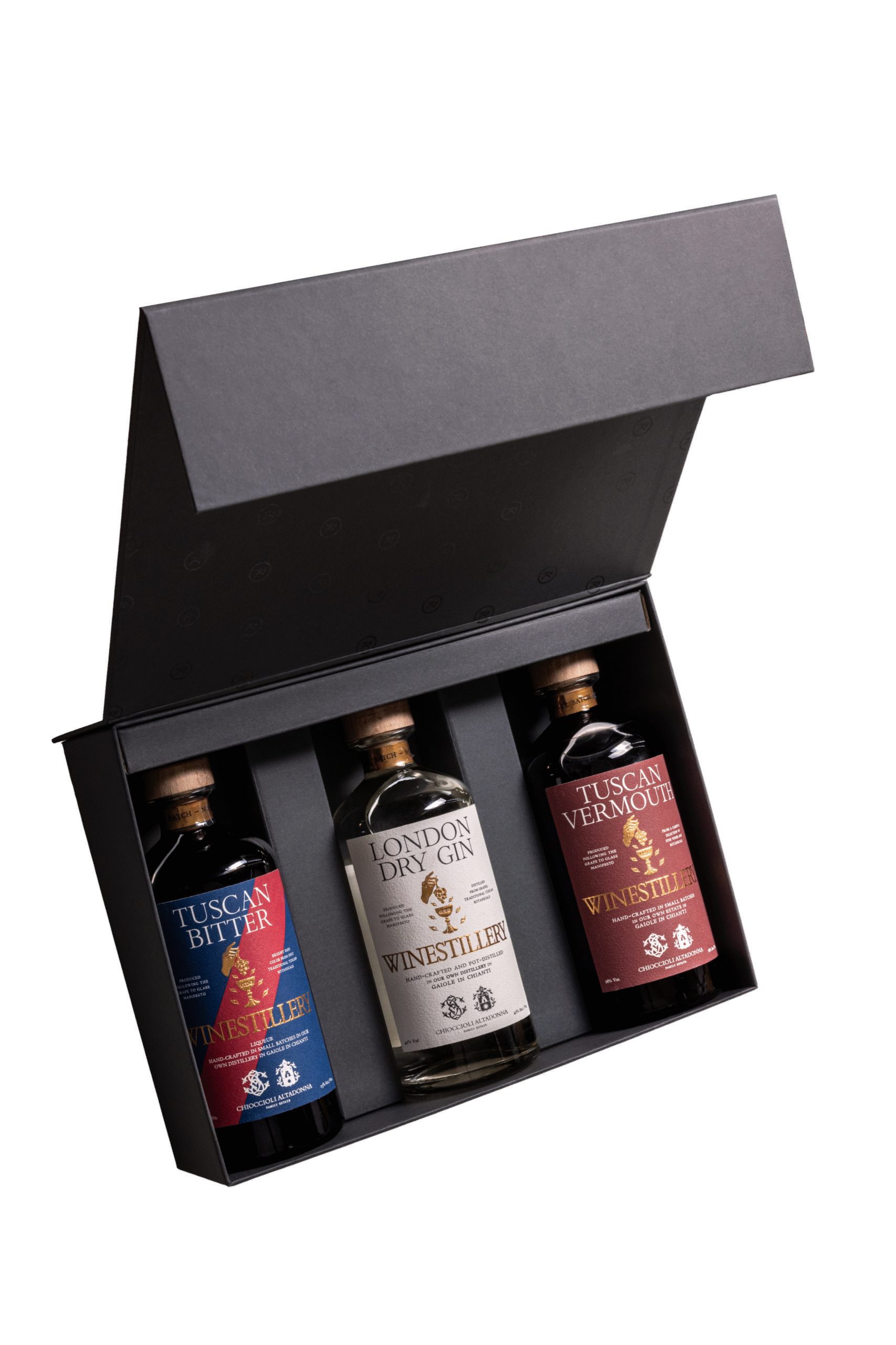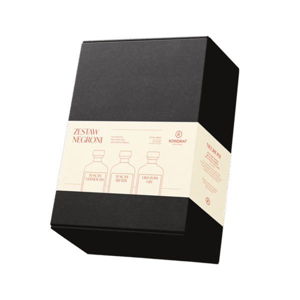 W przepięknym czarnym opakowaniu, otwierającym się jak skrzyneczka, znajdują się trzy alkohole mocne z destylarni Winestillery: toskański gin w stylu London Dry, Bitter produkowany zgodnie z protokołem rodziny Chioccioli Altadonna – w sercu Toskanii, na bazie destylatu z wina i naturalnych składników. Dopełnienie zestawu stanowi czerwony, wytrawny wermut stworzony na bazie toskańskiego wina ze szczepu sangiovese. Zestaw na pewno wprawi we wspaniały nastrój każdego smakosza alkoholi mocnych. Całość została ubrana w elegancką owijkę. Dodatkowo, umieściliśmy na niej przepis na klasyczny drink negroni, który przygotujesz samodzielnie w domu, korzystając z produktów zawartych w zestawie.