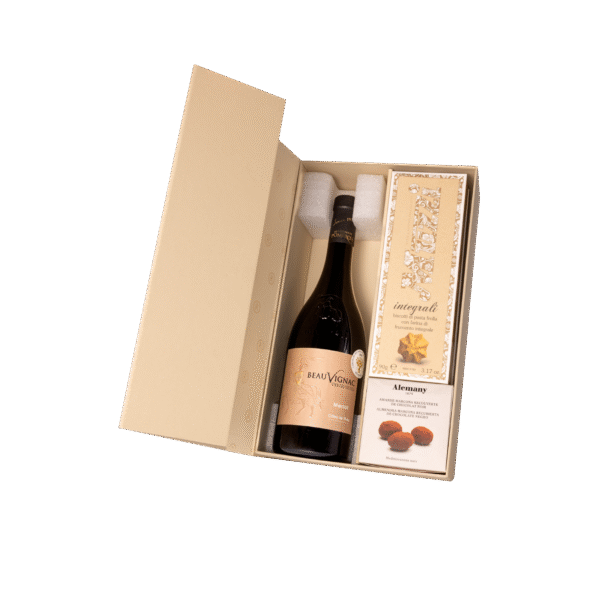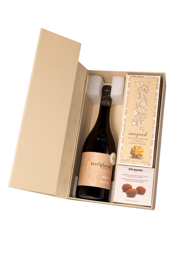 W przepięknym beżowym opakowaniu otwierającym się jak skrzyneczka znajduje się wino Costieres de Pomerols Beauvignac Vieilles Vignes Merlot IGT i słodkie dodatki takie jak: migdały w miodzie i ciemnej czekoladzie od producenta Alemany oraz kruche ciasteczka z mąki gryczanej od producenta Muzzi. Zestaw na pewno spełni oczekiwania każdego smakosza wina oraz amatora słodkich przysmaków. Całość została ubrana w świąteczną owijkę nadającą wyjątkowego charakteru.